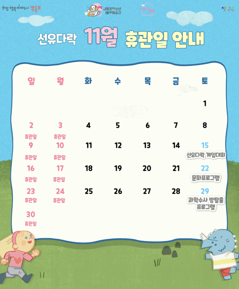 안녕하세요! 선유다락입니다.😊매주 일요일, 월요일은 정기 휴관일입니다! 이용에 참고 바랍니다.11월 15일(토) [선유다락 게임대회] 이벤트,11월 22일(토) [작은손 작업실] 문화프로그램,11월 29일(토) [과학수사 방탈출]프로그램이 진행될 예정이에요!많은 참여 부탁드립니다🥰11월도 선유다락에서 즐거운 추억들 만들어봐요~😍☎️문의 : 선유다락 070-4473-6705