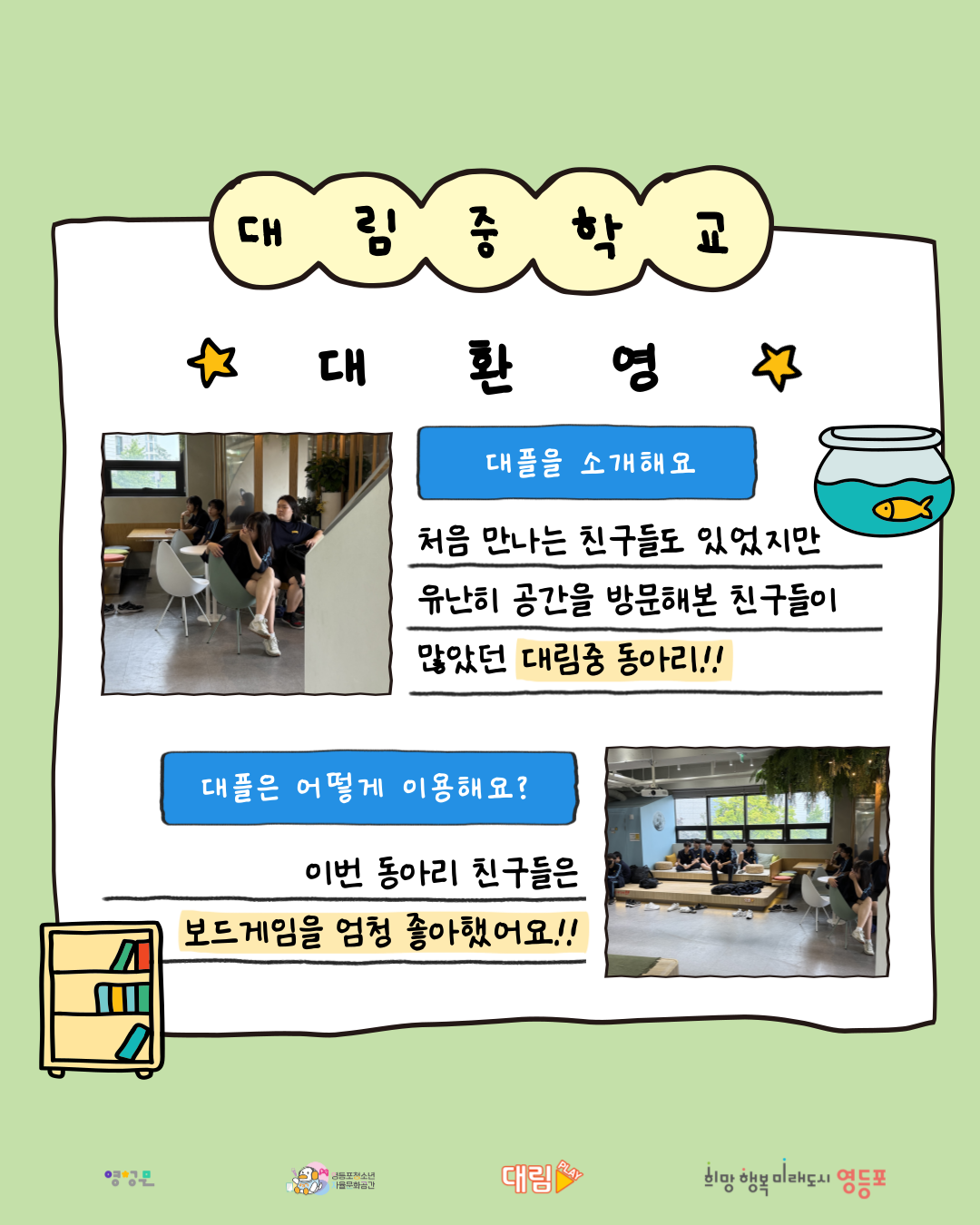 🙌대림중학교 방문🙌안녕하세요. 대림플레이입니다!😁7월 15일(화)에 대림중학교 동아리 친구들이 대림PLAY를 방문해주었습니다!대림플레이 이용 방법을 알아보고, 대림플레이의 공간을 소개하는 시간을 가진 후대림플레이에서 자유롭게 친구들과 즐거운 시간을 보냈답니다. 🥰보드게임을 좋아했던 대림중 동아리 친구들~~~ 즐거운 시간 보냈나요? 다음에도 놀러와요~!❣문의❣전화: 070-4100-6562~3*일,월요일 및 공휴일은 휴관일입니다.