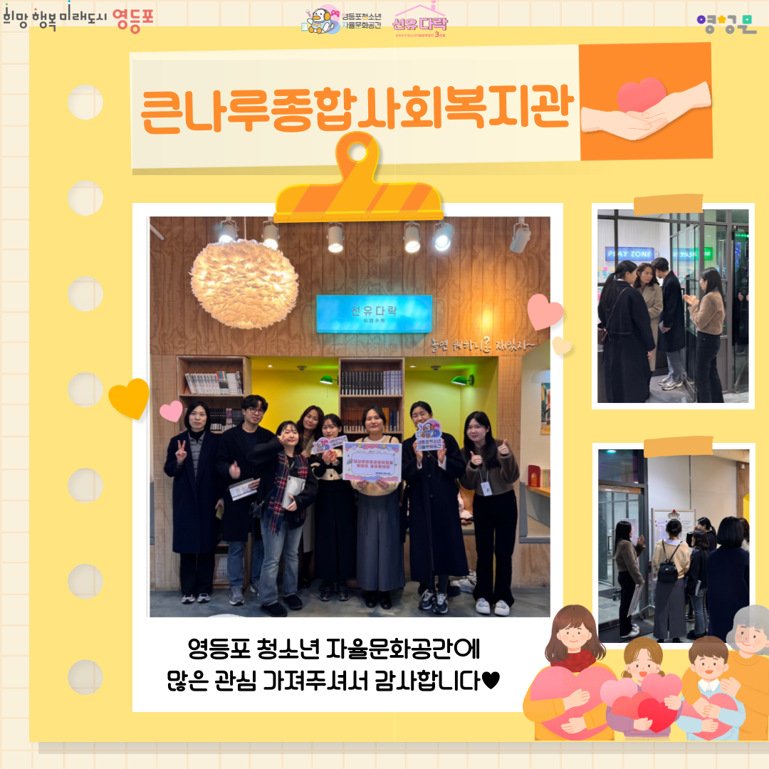 안녕하세요 선유다락입니다🥰오늘 2월 26일 큰나루종합사회복지관에서 선유다락에 방문해주셨습니다!청소년들이 이용하는 문화공간에 대하여 이야기하고, 더 나은 문화공간이 되기 위하여 어떤 방법들이 있을지