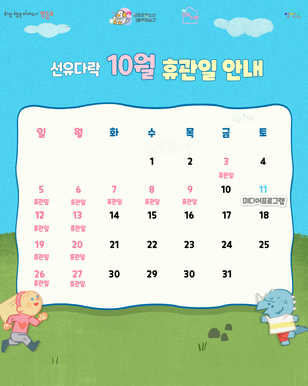 10월 선유다락은 매주 일요일, 월요일, 개천절, 추석연휴, 한글날까지 휴관이므로 이용에 참고 부탁드립니다💫